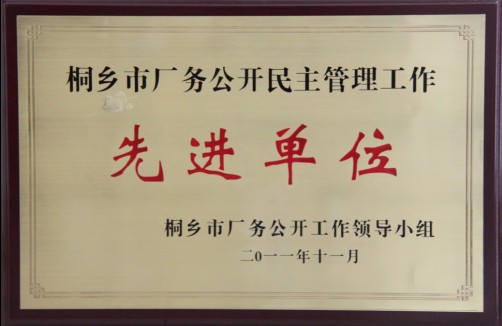 公司榮獲“桐鄉(xiāng)市廠務(wù)公開民主管理工作先進單位”稱號