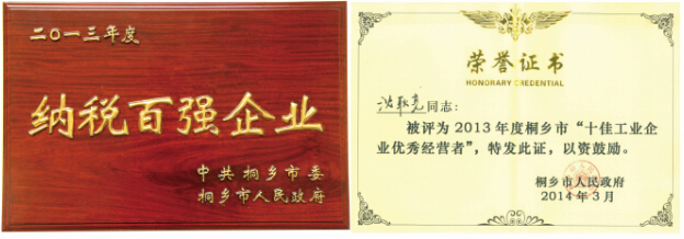 會(huì)議由桐鄉(xiāng)市盧躍東書記主持,首先為2013年度納稅百強(qiáng)企業(yè)、工業(yè)企業(yè)優(yōu)秀經(jīng)營者、科技進(jìn)步企業(yè)、創(chuàng)業(yè)創(chuàng)新領(lǐng)軍人才頒獎(jiǎng)。我公司榮獲“2013年度納稅百強(qiáng)企業(yè)”稱號(hào),同時(shí)董事長沈耿亮獲得桐鄉(xiāng)市2013年度“十佳工業(yè)企業(yè)優(yōu)秀經(jīng)營者”榮譽(yù)稱號(hào)。沈總接受表彰并與獲獎(jiǎng)企業(yè)代表們合影留念。